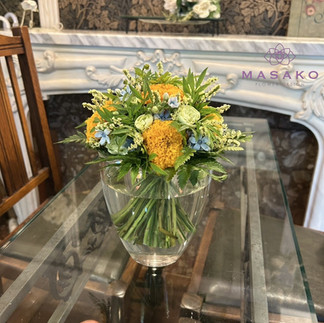 は花束の大部分を占めるくらい大きいマリーゴールドを使用しました。変に一種類だけ目立たない様、全体の統一感を大事に作成しました。共通のお花を全体に配置する事と、同じ並びで単調にならない事を両立させるよう意識しました。