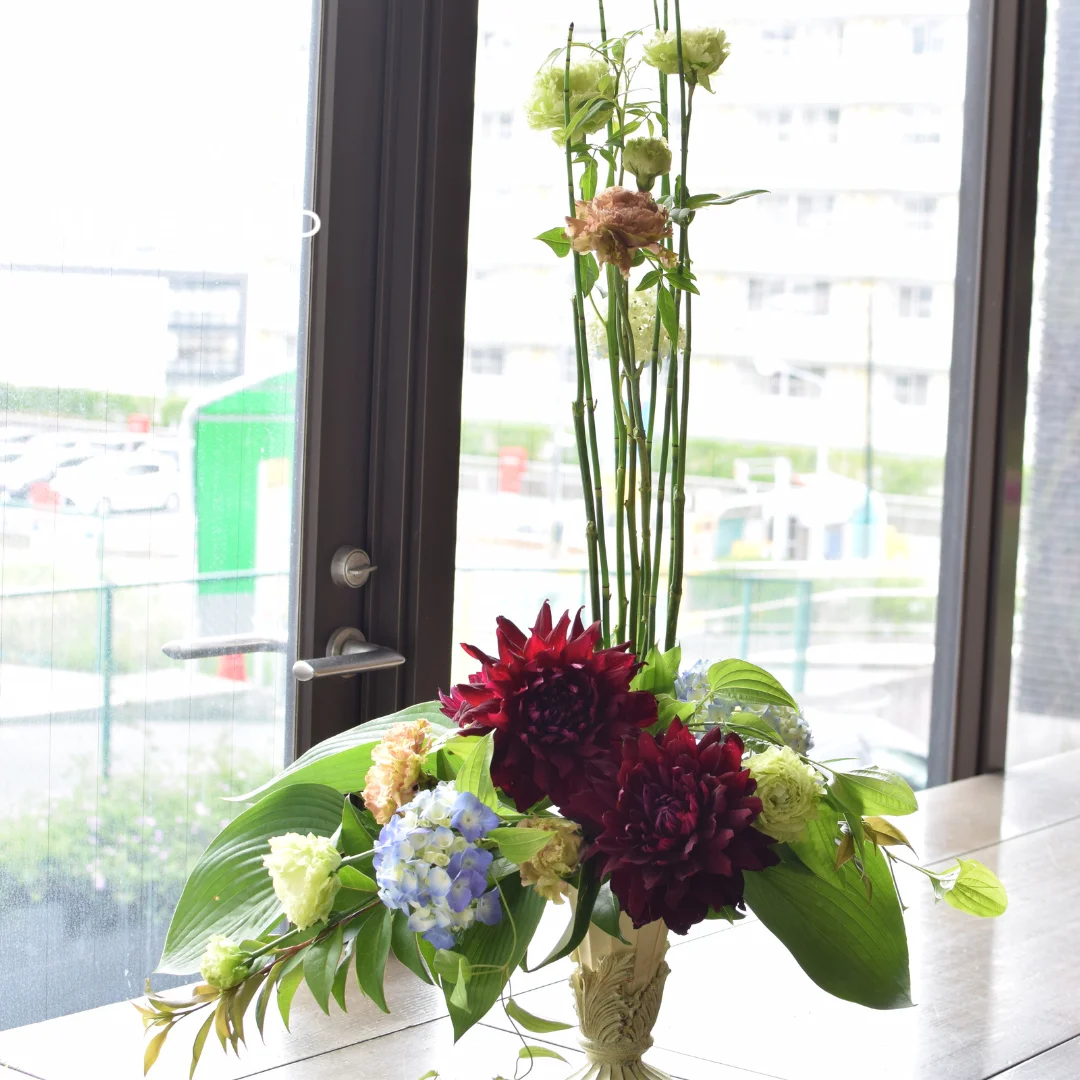 インパクトのあるダリア黒蝶は先生のアドバイスで2輪をあえて重ね気味に配置し、もう1輪は奥に挿す事で全体に奥行きが出てバランスが取れました