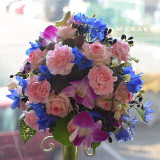 モダン-装飾的ブーケ=底辺に配置するお花の茎を短く切りすぎてしまうので、円錐形の形にするのが難しいので今後改善できたらと思います。