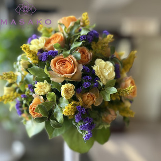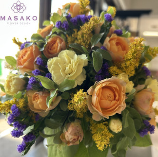 MASAKOフラワーデザインスクール、NFD公認校です。NFD資格検定、国家資格フラワー装飾技能検定、指導校で今回NFD講師取得レッスン3級テーマ「モダンー装飾的ブーケ」を受講なさいました。千枝さんの作品をご紹介いたします。